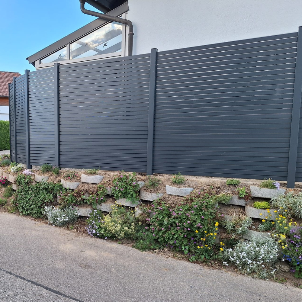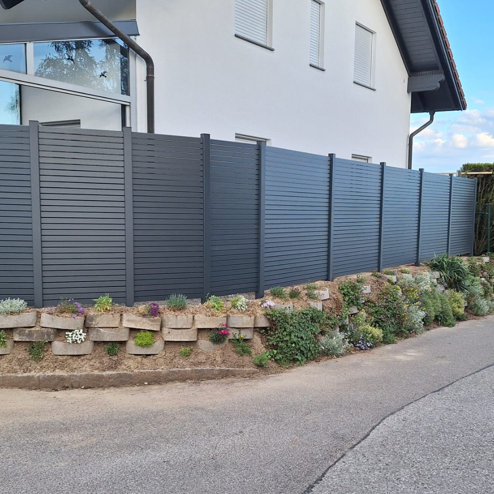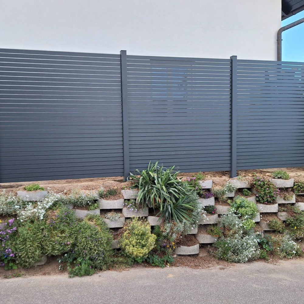 Die ModuLine Aluzaun MARIO-Elemente kombinieren modernes Design mit Langlebigkeit. Egal ob in Rechteck- oder Rhombus-Optik, sie bieten optimalen Sichtschutz und eine stilvolle Optik. Dank ihrer speziellen Aluminium-Legierung sind sie extrem witterungsbeständig und wartungsfrei.