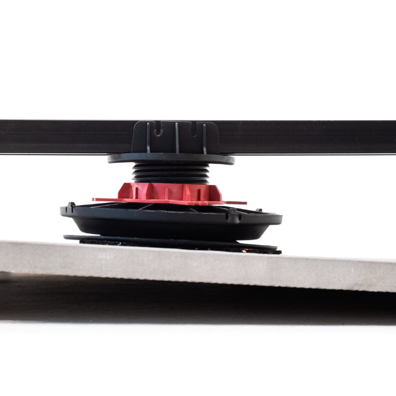 - Selbstnivellierend bis 5%: Die Basis ist ein selbstnivellierender Aufsatz, welcher auf das Balkenlager geclipst wird. Dadurch kann ein Gefälle von bis zu 5% automatisch ausgeglichen werden. Ideal für unebene oder schräge Untergründe.