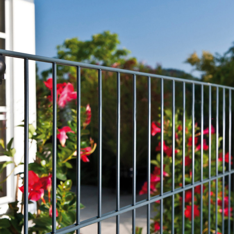 Die Doppelstabmatte ist 2510 mm lang und in diversen Höhen und Oberflächen auswählbar. Die Bezeichnung 6/5/6 oder 8/6/8 beschreibt die jeweiligen Drahtstärken. Sie ist mit all unseren Pfostentypen kombinierbar und die ideale Wahl für einen klassischen Gartenzaun.