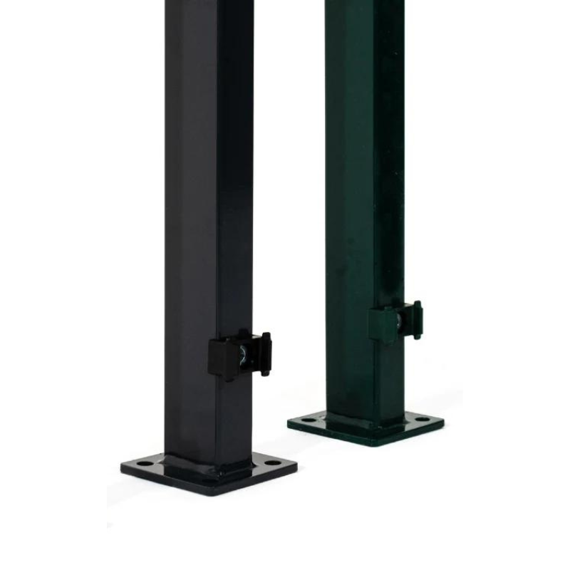 - Pfosten zum Aufdübeln haben eine angeschweißte Bodenplatte (100x100 mm für Höhen bis einschließlich 1630 mm, ab einer Zaunhöhe von 183cm werden Pfosten zum Einbetonieren inkl. einer Bodenkonsole geliefert)