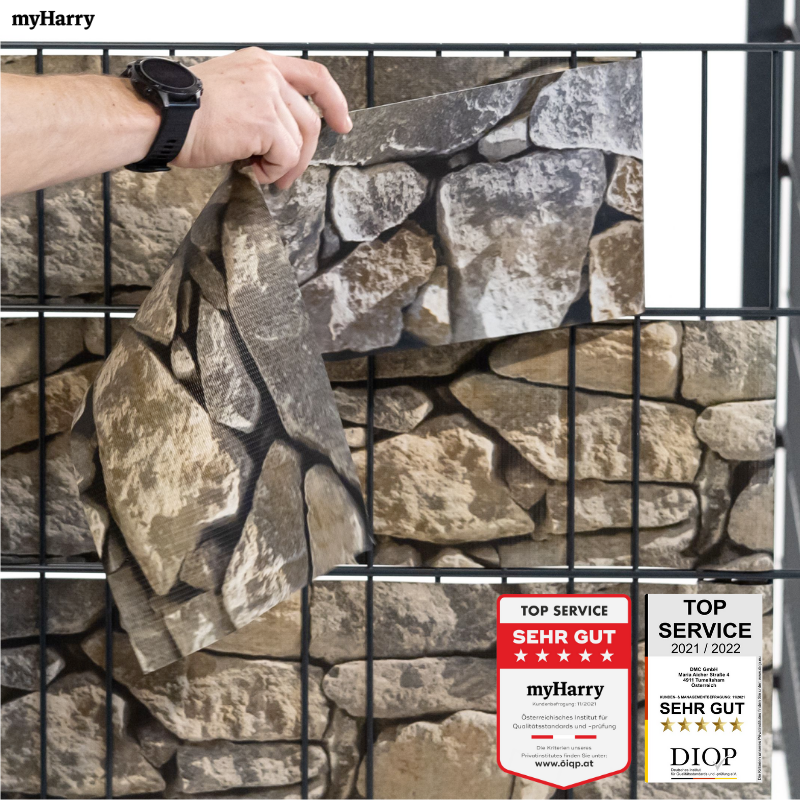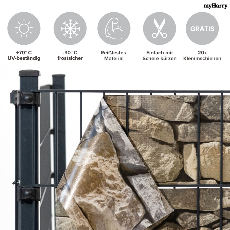 Die PVC Sichtschutzrollen in Steinoptik sind optimal als Sichtschutz für Ihren Garten geeignet. Zum Einflechten in die 20cm hohen Maschen jedes Doppelstabmattenzauns.