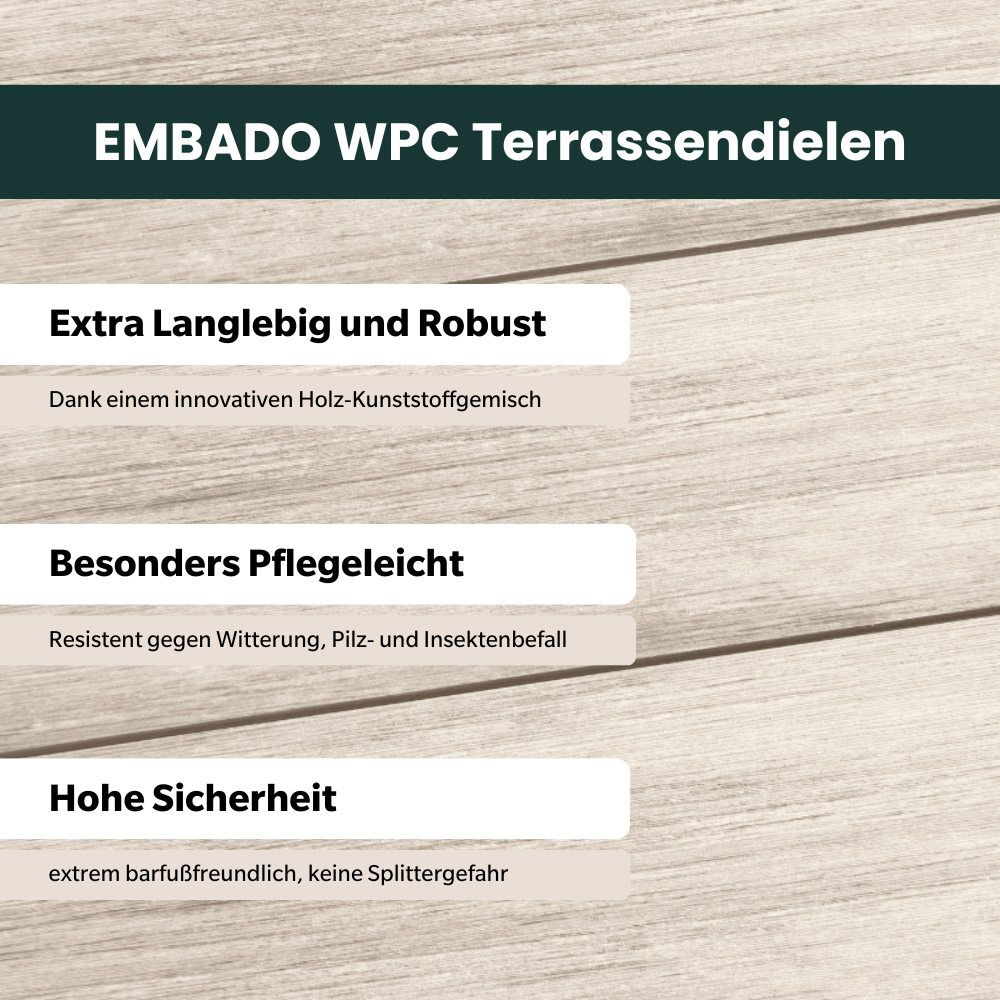 WPC-Terrassendielen von myHarry sind sowohl bruch-, kratz- als auch stoßsicher. Zusätzlich sind sie beständig gegen Pilze, Algen, Witterungseinflüsse und UV-Strahlung.