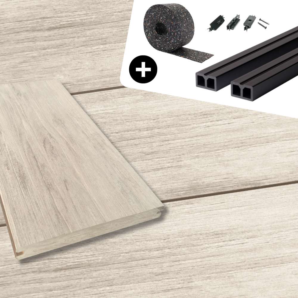 Das Rundum-Sorglos-Paket für deinen Terrassenbau: Pflegeleichtes und langlebiges WPC-Komplettset Elfenbein Antik Massivdiele